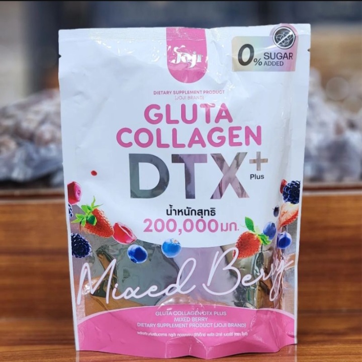 JOJI Gluta Collagen DTX Mixed Berry 10 Sachets Dietary supplement in powder form mixed berry flavor which contains a mixture of glutathione, collagen from marine fish and citrus fruit extract powders such as strawberries, raspberries and blackcurrants. The taste is mellow, fragrant, delicious and not fishy. Can drink easily and conveniently in 1 sachet with 100 cc cold water, stir to dissolve and drink immediately. Helps to whiten the skin and look good.